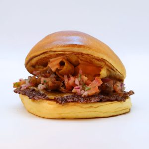 Pan, mayonesa de chipotle, carne aplastada, queso cheddar, pico de gallo, shimeji con mole, fritos.