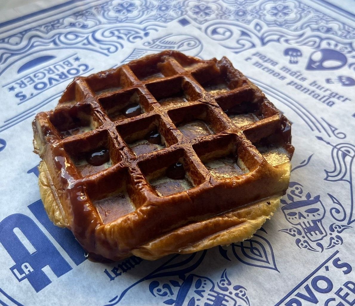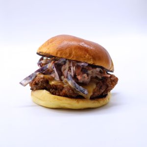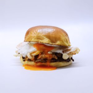 Pan, Mayonesa trufada, Carne aplastada, Shimeji plancha, Huevo frito y Cebolla caramelizada