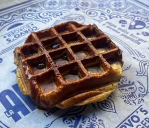 Pan, Salsa queen, Carne aplastada, Queso, Bacon, Cebolla caramelizada, Lechuga, Tomate y Pepinillo